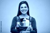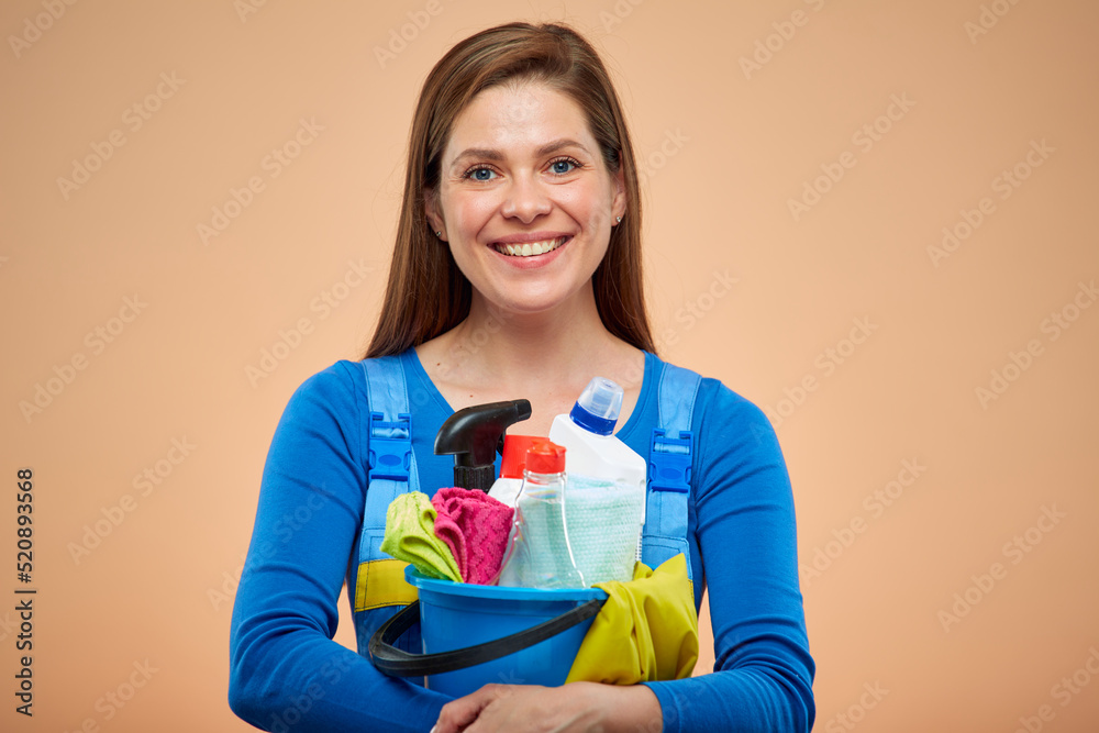 Smiling woman in blue overalls holding cleaning products in bucket. isolated on brown background.