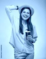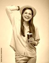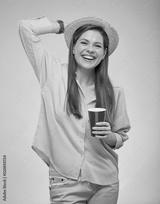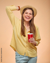 Smiling happy young woman in summer hat holding coffee cup. isolated portrat on yellow.