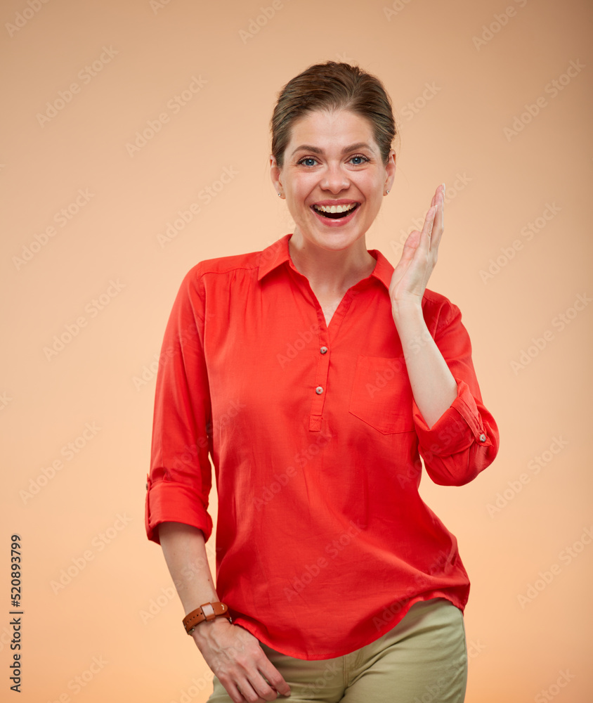 Happy laughing young lady in red shirt isolated portrait.
