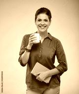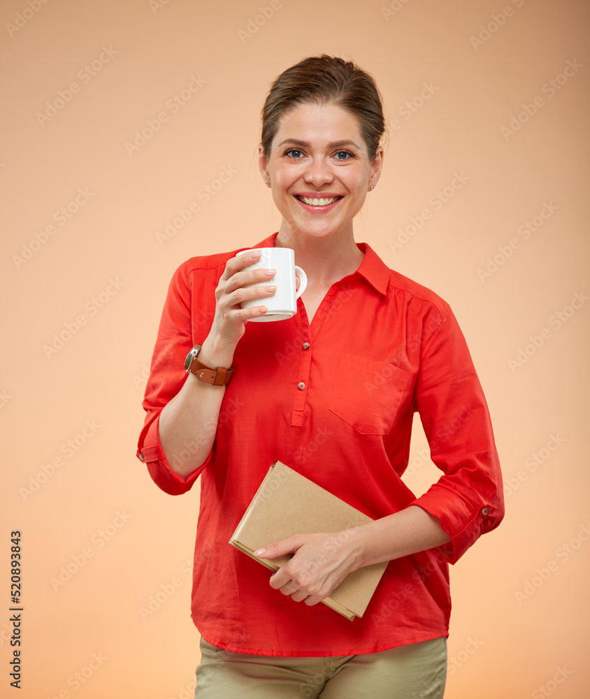 Student woman in red shirt holding book and white mug, isolated studio portrait on beige, brown background.