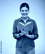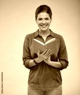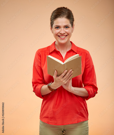 Smiling female student in red shirt holding open book, isolated studio portrait on beige, brown background.