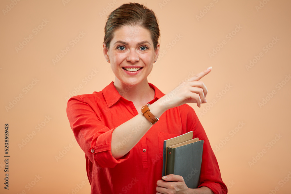 Teacher or student in red shirt with book pointing finger at side away, isolated portrait.