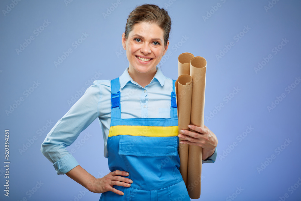 Smiling woman architect in blue overalls holding blueprint. Isolated female portrait.