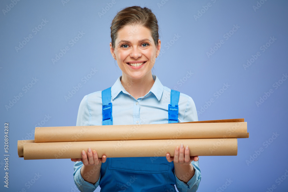 Woman adult student builder in overalls holding blueprint. Isolated portrait.