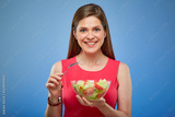 Young smiling lady in red dress holding salad bowl isolated portrait on blue background.