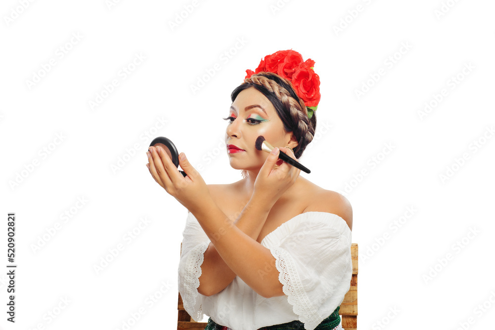 Mexican woman made up with Mexican flag colors wearing white dress. Mexican woman seated making herself up.