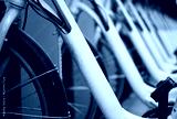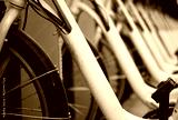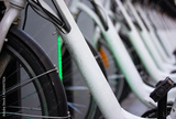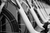 Bicycle parking on city street. Lots of white bikes for rent parked hardly. Environmentally friendly transportation. Ecological e-transport. Details of the bike - spokes, tire wheel macro detail photo