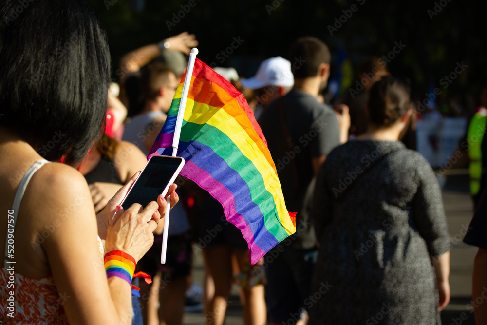Young woman using mobile phone, holding a rainbow LGBT flag in hand on Pride Month. Lesbian, gay, bisexual people at parade, festival have fun joy. Crowd of people at celebration. Tolerant community.
