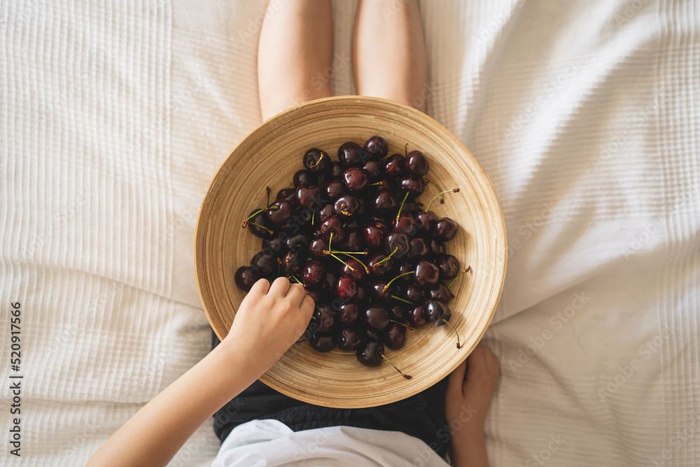 Wooden bowl with fresh juicy berries. Cherries in hands. Organic eco product, farm. Non GMO. Fresh red cherries.