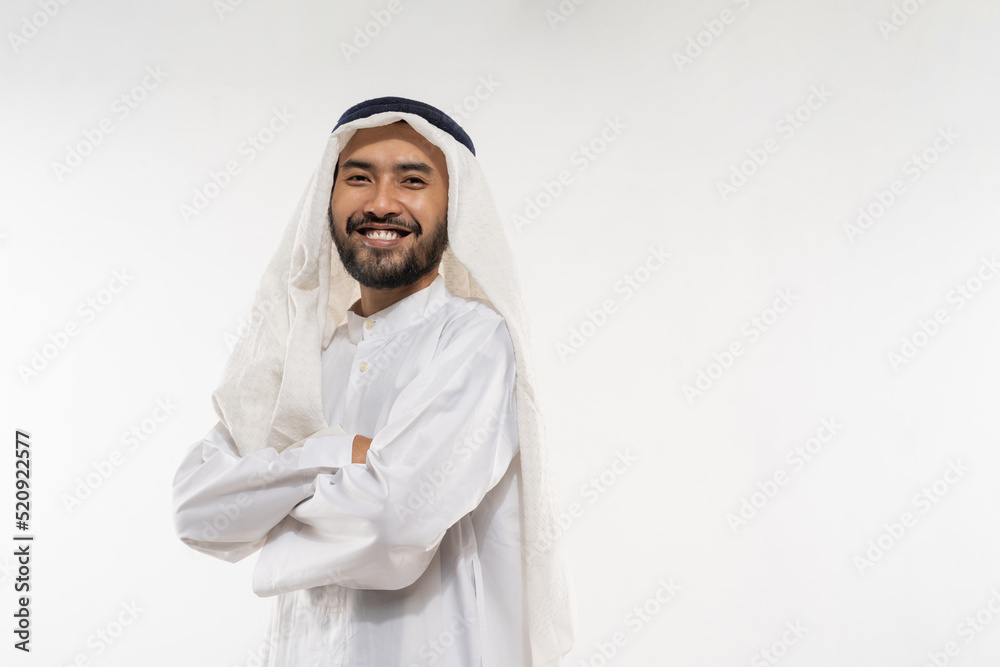 an arabian young man in a turban standing smiling with crossed hands on a plain background