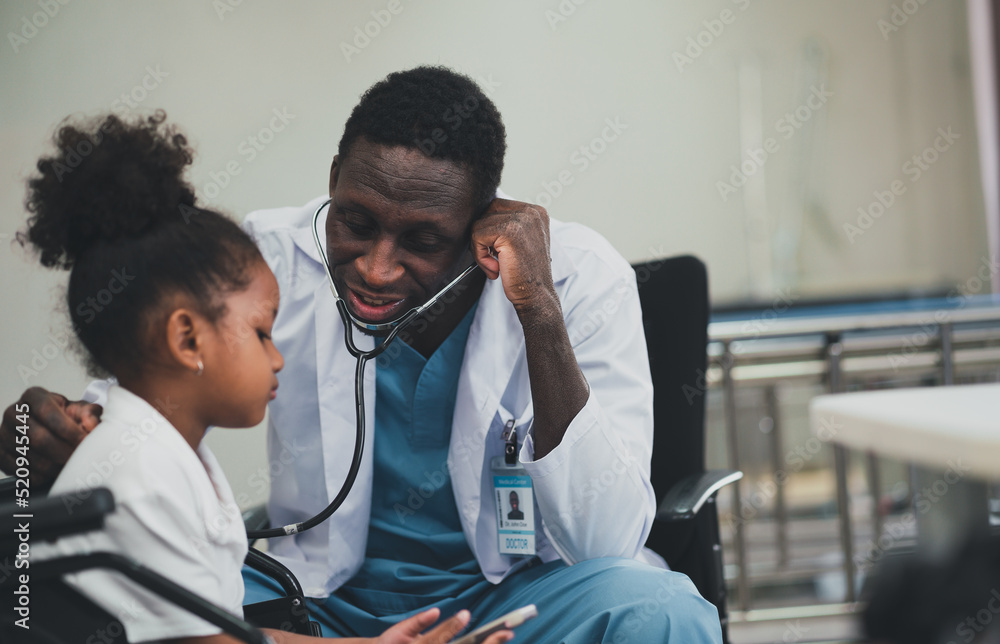 The concept of medical care, African male pediatricians, children's ears, children's patients, pediatricians check children's lung breathing.