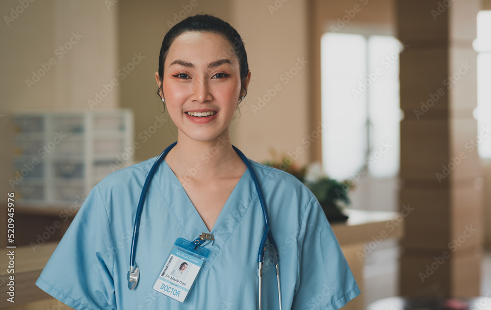 Concept of medical care. Asian female doctor of medical personnel, assistants, patients in the hospital