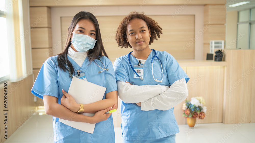 Concept of medical care. Team of medical personnel, assistants, patients in the hospital