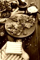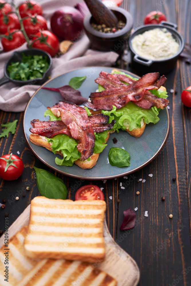 bacon and cream cheese sandwiches on a plate on wooden table at domestic kitchen