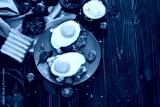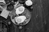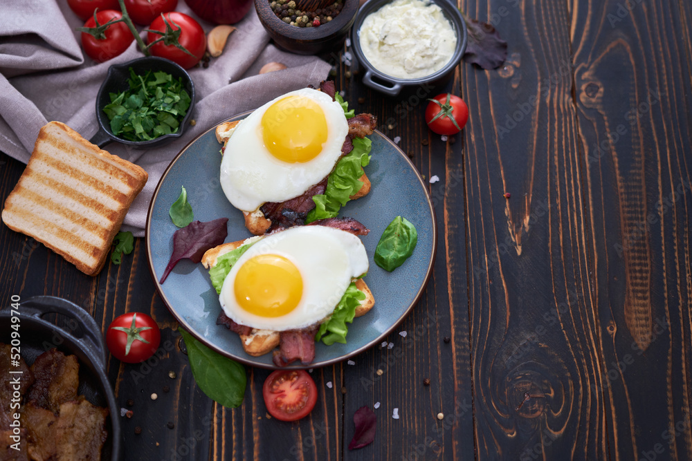 Fried eggs, bacon and cream cheese sandwiches on a plate on wooden table at domestic kitchen