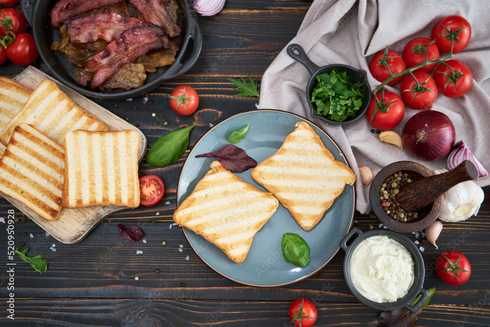 making bacon and cream cheese sandwich - ingredients on wooden table