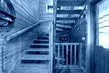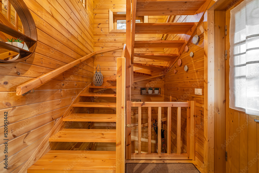 Wooden stairs in a small country house. Hallway of cozy house in a village.