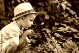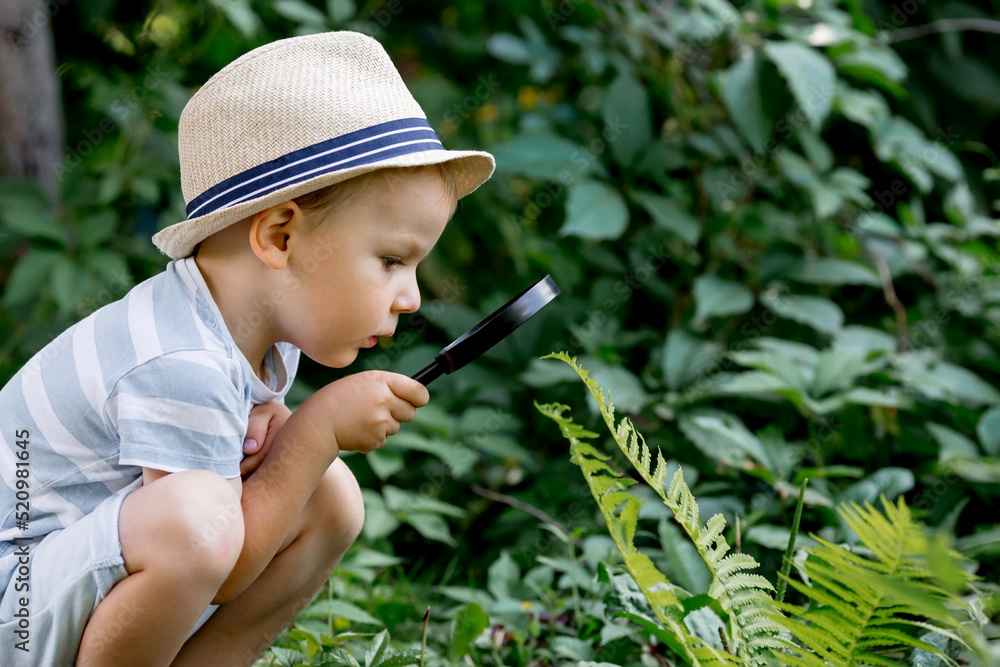 Summer holidays. A small child in a hat looks at the leaves with a magnifying glass. A preschool boy studies nature with a magnifying glass. Education, excursions, research concept.