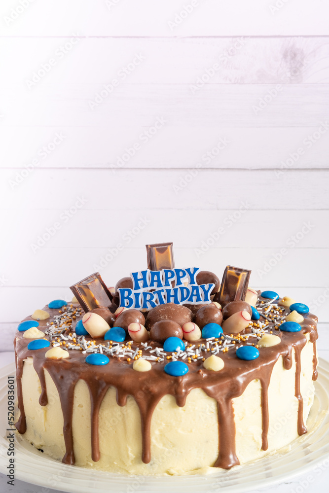 Extravagant Vanilla and Chocolate Birthday Cake with a Variety of Chocolates and Ganache on Light Background with Copy Space