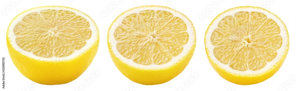 Set of half of yellow lemon citrus fruit isolated on white background with clipping path. Full depth of field.