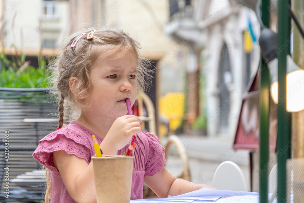 Street portrait of a little girl drawing with colored pencils at a table in an outdoor cafe on a blurry background of the old town.