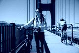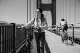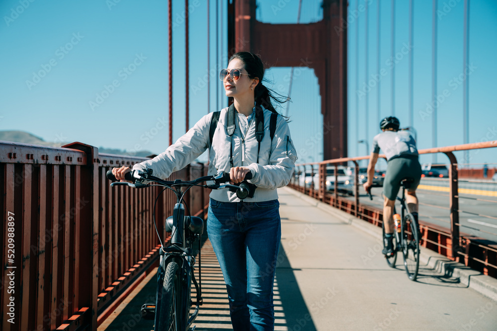 Asian woman is looking into distance and enjoying the view while walking with a bike on golden gate bridge at leisure on a sunny day in San Francisco California