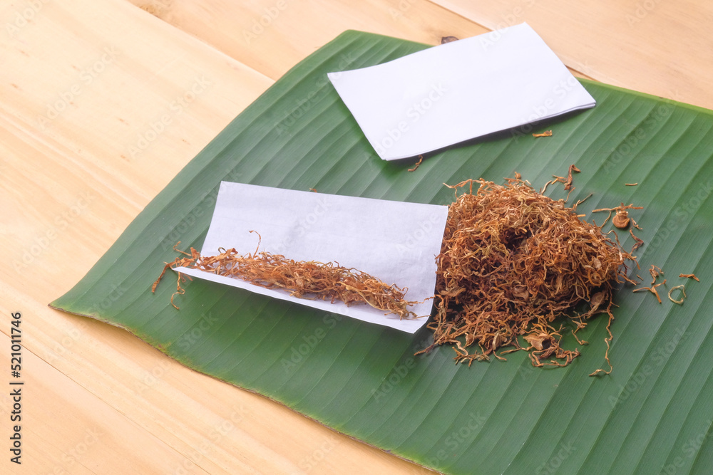 Homemade dry tobacco and cigarette over banana leave on the brown wooden table.
