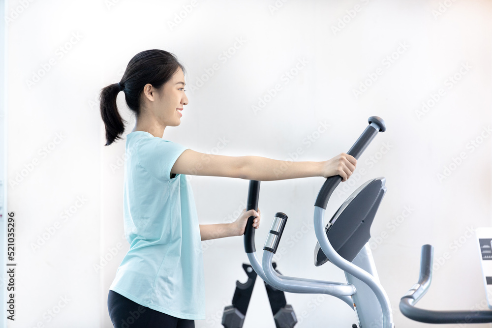Beautiful and shapely Asian woman working out in the gym, Play exercise machine treadmill, Dumbbell, stretching, Hanging bar, Barbell, Cardio, Stretch, Woman warming up in the gym, Jump rope.
