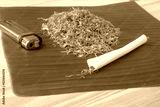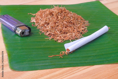 Homemade dry tobacco and cigarette over banana leave on the brown wooden table.