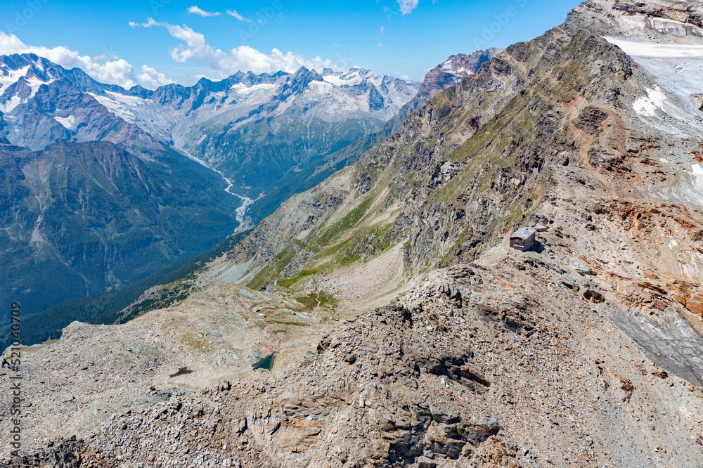 Panoramic aerial view of the Bernina Group and the Scerscen Refuge in Valmalenco, Italy, July 2022