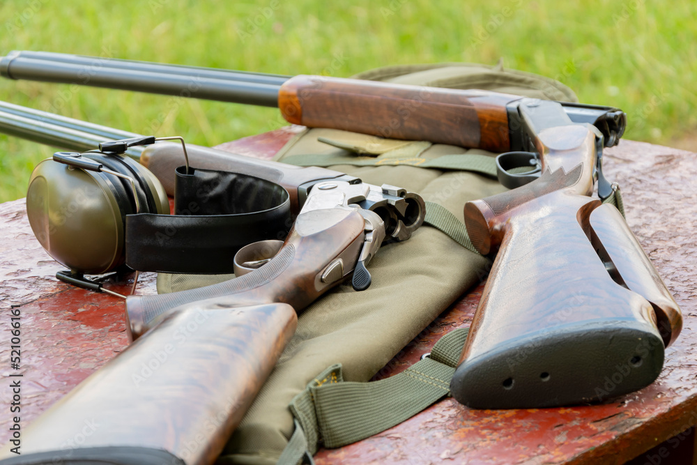 Sporting double-barreled rifles and headphones for shooting lie on a wooden table against the background of the shooting range, bench target shooting.