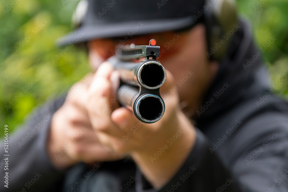 A male shooter aims a sporting double-barreled hunting rifle, target shooting, selective focus.