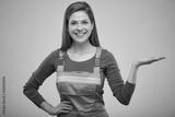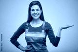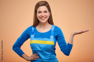 woman worker or student in blue overalls with empty hand. Isolated female portrait.
