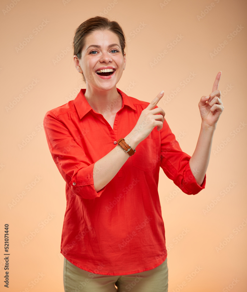 Smiling young lady in red shirt pointing fingers up, isolated female portrait.