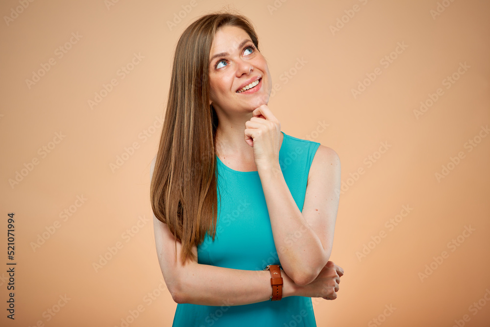 Smiling thinking woman in azure green dress isolated portrait. Young lady with long hair looking up.