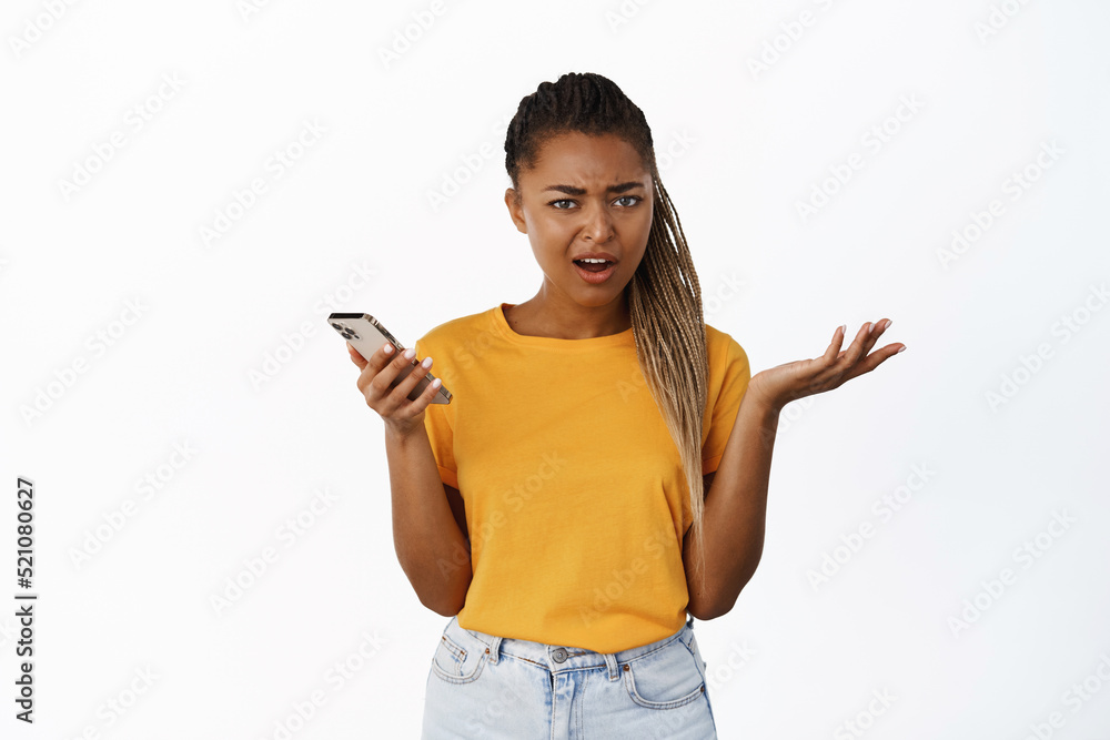 Confused and annoyed Black girl reacts to smartphone notification or phone message, shrugging puzzled and frowning, standing over white background