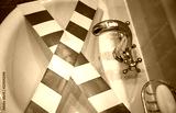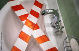 The water tap in the bathroom is covered with a red forbidding tape. It is forbidden to use water. Danger of poisoning with tap water.
