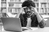 Tired tense indian or arabian guy, university student, wearing stylish shirt, sits at a table in the library, closed his eyes, massages his whiskey, tired of boring studies, has a headache,needs break