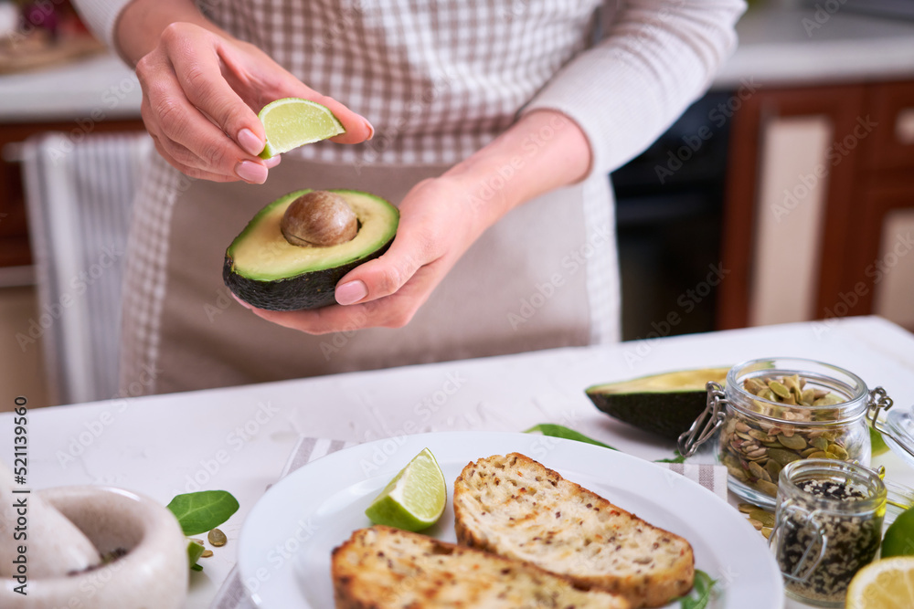 Woman squeezing fresh lime juice on a halved avocado at domestic kitchen