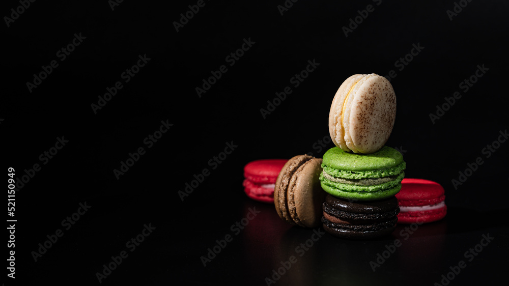 A french sweet delicacy, macaroons variety closeup.macaroon colourful on black colour background.