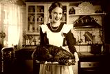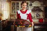 Housewife holding a large turkey in the kitchen, 50s retro style