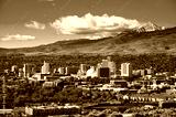 Downtown Reno skyline, Nevada, with hotels, casinos and surrounding mountains