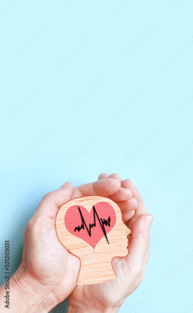 Hands holding wooden brain and heart, brain stroke, world heart day, world mental health day, Alzheimer concept
