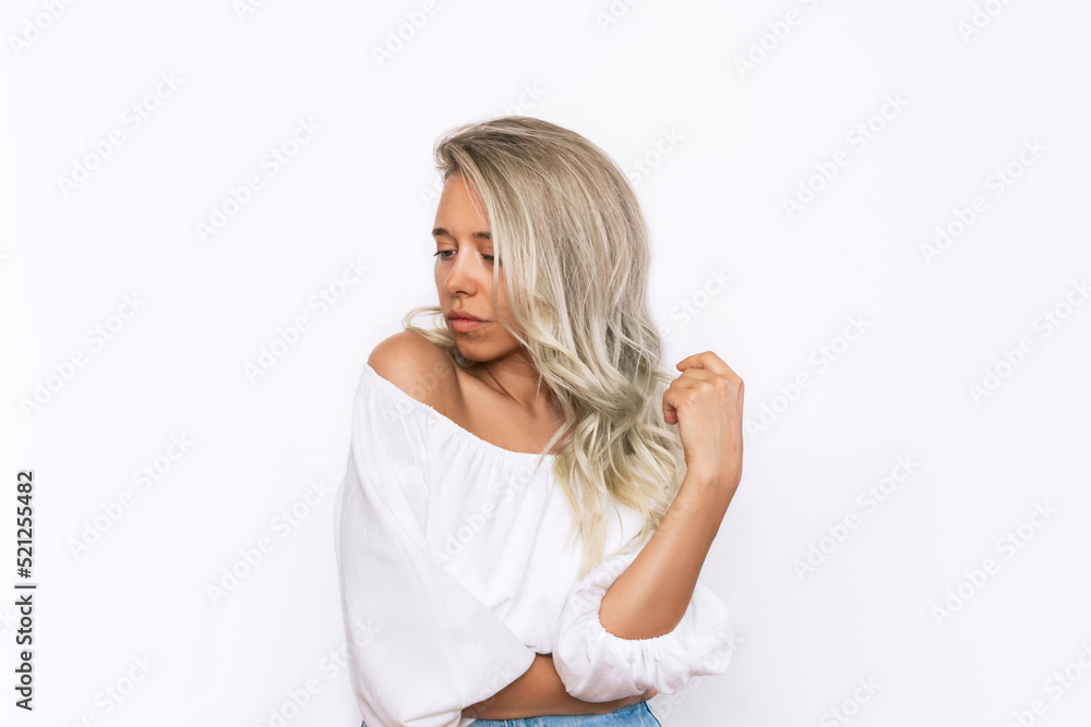 A young caucasian charming attractive tanned blonde woman in a white blouse isolated on a white background. Tenderness