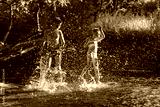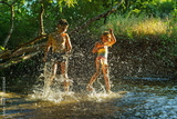 children playing in the river. A girl and boy raises her hands up in the water and splashes water drops