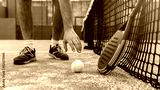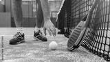 One caucasian man catch a yellow ball near the padel racket on green court grass