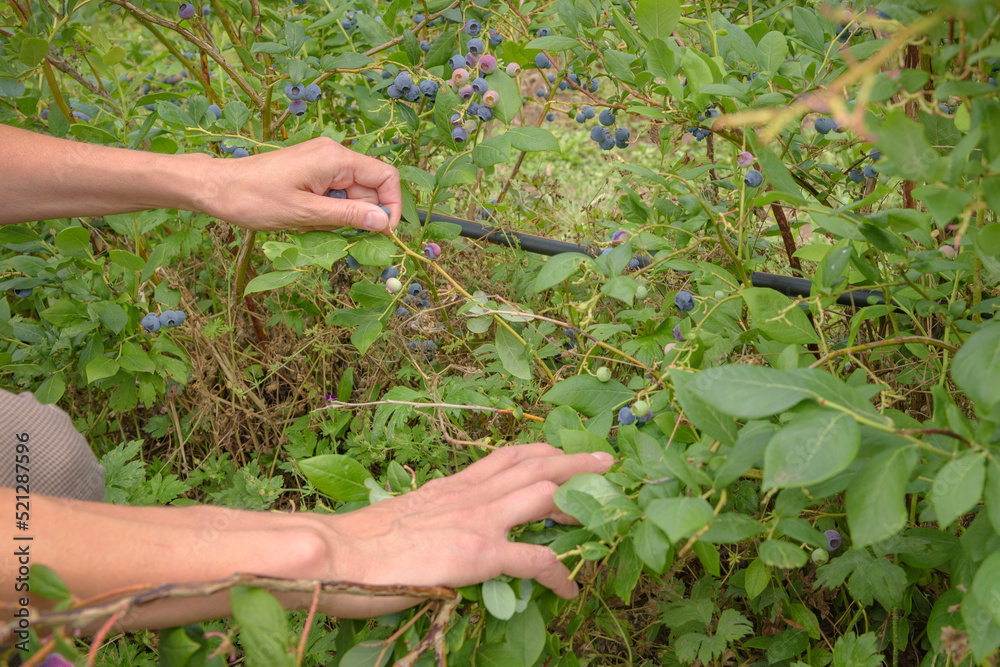 Blueberry picking in the field, selection of ripe berries close-up Vaccinium corymbosum