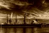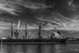 Сontainer ship in port with harbor cranes in the background black and white