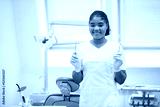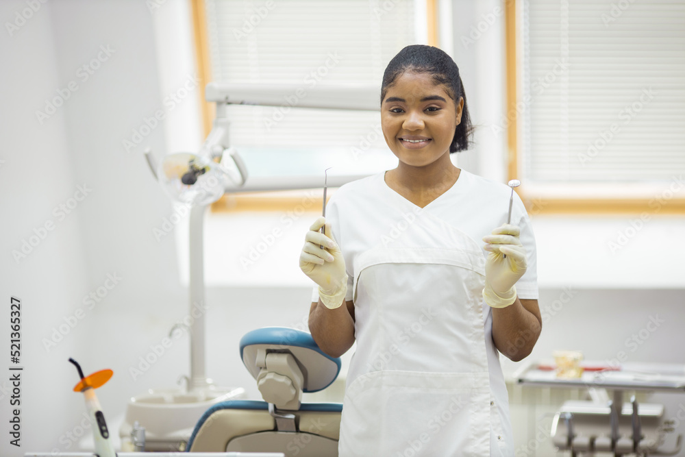 portrait of african american woman dentist in white coat with toothbrush and plastic jaw