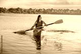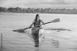 girl rowing a kayak on the lake. A girl in a canoe on a water excursion, active pastime
